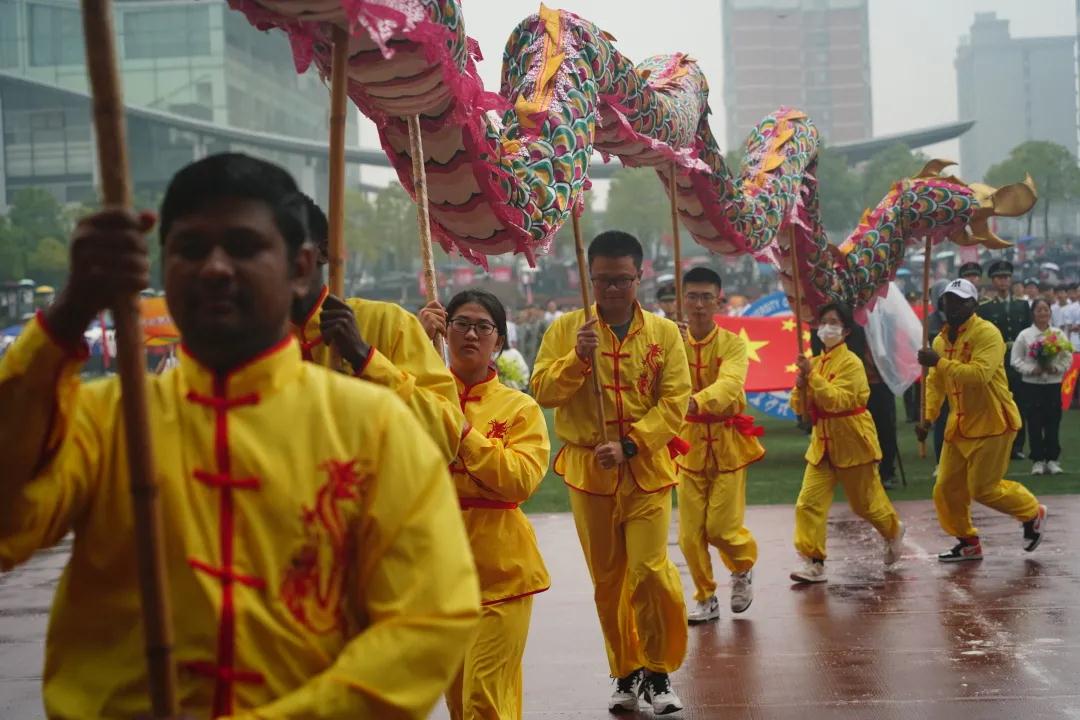 开幕式上,来自老挝、孟加拉国、肯尼亚、加纳、赞比亚、阿富汗等20余个国家的30余名留学生与中国学生和老师们携手组成国际学院方阵。他们手持中外国旗,高喊着“多元荟萃、海纳百川、千帆竞渡、国际远航”的口号,以饱满的精神、灿烂的笑容与稳健的步伐迈向主席台。