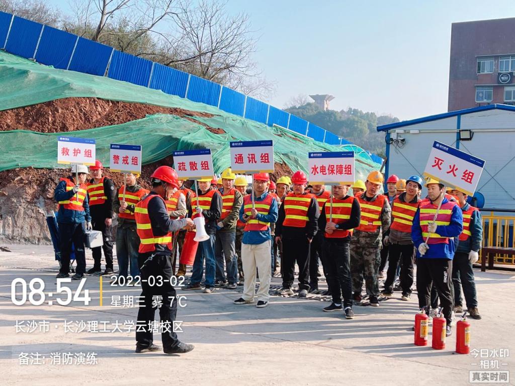 为贯彻落实安全第一、预防为主、综合治理的安全生产方针,进一步增强建筑施工现场人员防火安全意识,提高施工人员响应突发事件的能力和水平,在437必赢会员中心基建处指导下,2022年3月2日代建单位(湖南国际工程咨询中心)组织监理(友谊咨询)施工单位(顺天建设)现场作业人员开展消防应急疏散演练活动。