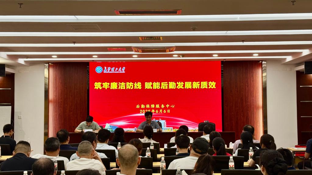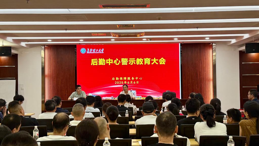 6月6日下午后勤中心在图书馆B102会议室召开警示教育大会。后勤中心主任周娇林主持会议。中心全体领导班子成员、各部门班组长以上管理人员、托管食堂项目经理、施工入围单位负责人、原材料入围单位负责人代表共111人参加会议。