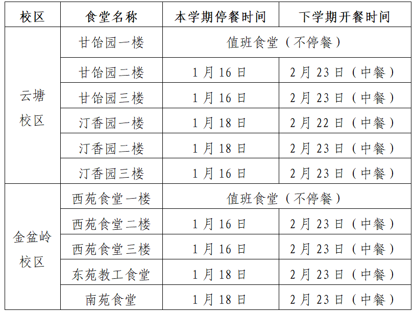 因临近放假,学生陆续离校,就餐人数明显减少,后勤中心餐饮服务部各食堂停、开餐时间作如下安排: