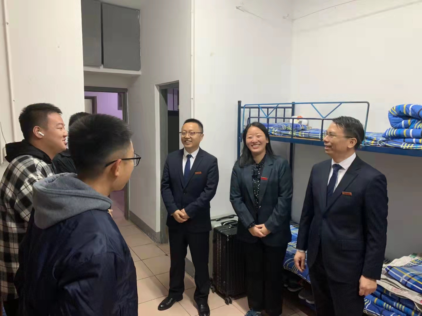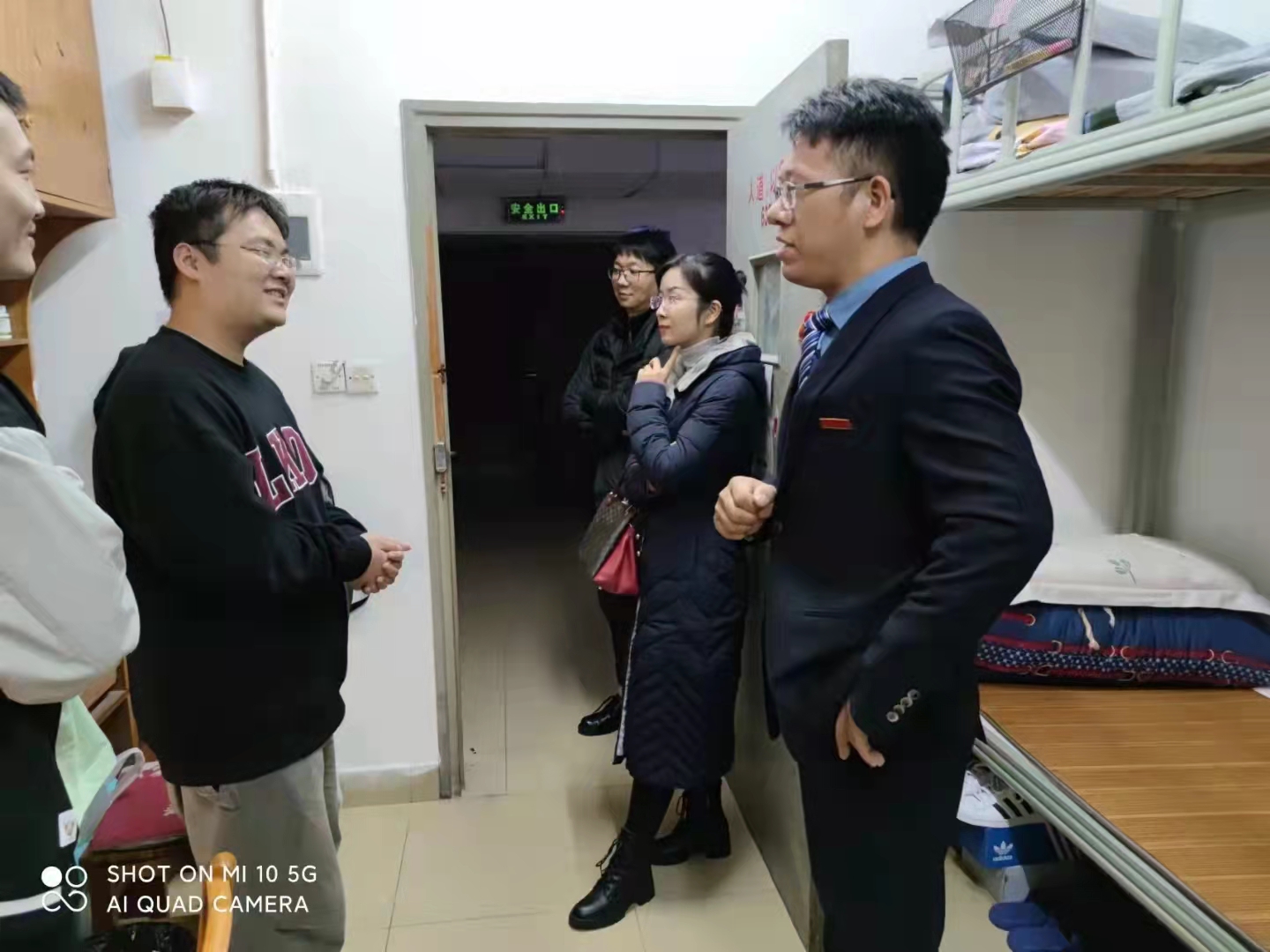 2021年11月7日晚上9点,化学化工学院党委负责人宋刘斌老师、副院长张跃飞老师、党委副书记兼副院长陶双老师、副院长陈启杰老师、副院长喻林萍老师、副院长卿志和老师、专职组织员邓豫老师、学校资产管理与实验室建设管理副处长李江胜、教师代表张玲和周怡波以及辅导员孙佳乐、张航、王彪分别走访了2021级本科生和研究生新生宿舍,在寒冷的冬夜给同学们送去了温暖和慰问。