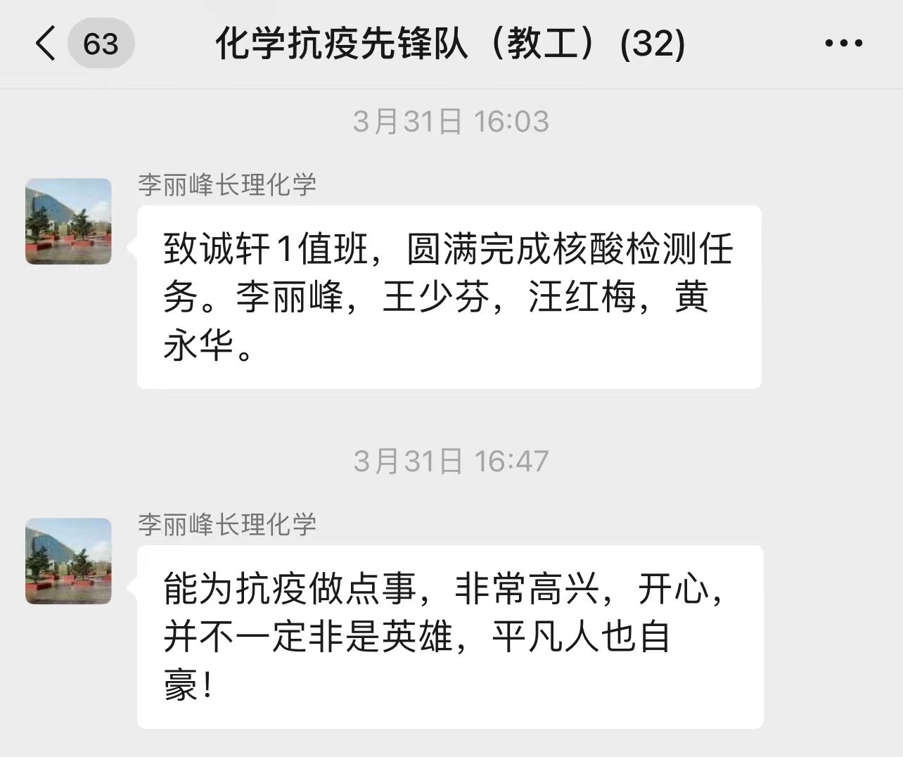 学院资深教师李丽峰,在提到为何每次都积极参与志愿者服务时,她说:“我当志愿者是真心愿意为大家做点事,也觉得自己没做什么。”李志伟、李中、张雄飞、王少芬等资深党员更是表示“每次只需要半天吗,没有课的时候,全天也可以”。辅导员江洁老师怀着身孕,也积极参与了核酸检测的协助工作。