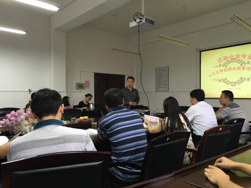 会议由学院书记程云辉教授主持,应用化学专业负责人李宇春教授做了专业综合改革开题汇报,在概要汇报了专业特色、社会影响及专业进步等情况后,李教授重点汇报了培养计划、校企合作、课程教材、实践教学、教学方式方法改革举措。在创新实践教学模式方面,提出工程实践能力的培养建立并完善“三阶段、三结合”的实践教学模式,并且明确提出了应用化学十三五建设目标:“行业一流专业”