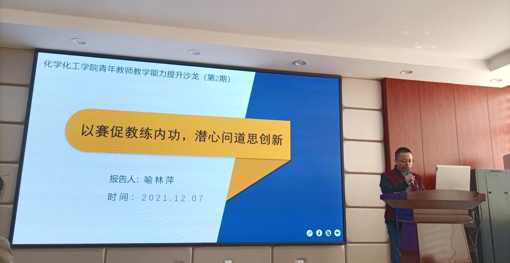 为提高青年教师教学能力,鼓励青年教师积极参与教学竞赛,2021年12月7日上午化学化工学院教师能力发展中心在云塘校区工科三楼A-320会议室举办了第二期教师教学能力提升沙龙。本期沙龙由院党委负责人宋刘斌主持,学院党政班子全体成员出席沙龙并给予指导。沙龙特邀请学院副院长喻林萍副教授做了题为“以赛促教练内功,潜心问道思创新”的教学竞赛经验交流。学院对教学竞赛感兴趣的老师和45岁以下青年教师参与了经验交流。