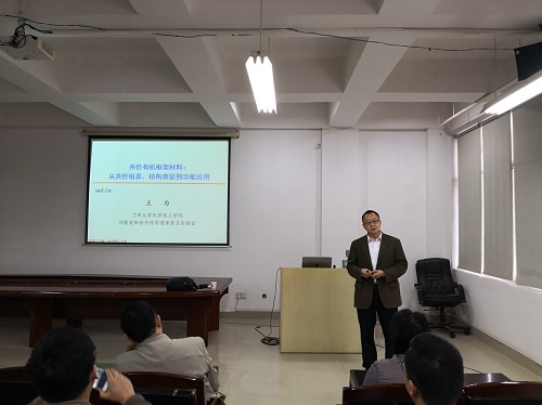 11月8日上午,国家杰出青年科学基金获得者、教育部“长江学者”特聘教授、兰州大学功能有机分子化学国家重点实验室主任王为教授应邀来必赢官网进行学术交流。在云塘校区工科三号楼A320会议室,王为教授以“共价有机框架材料:从共价组装、结构表征到功能应用”为题,给大家带来了一场学术盛宴。学术报告会由化学与生物工程学院院长杨荣华教授主持,副院长曹忠教授、副院长朱志平教授、副院长张跃飞教授及化学、化工、食品等相关学科的老师、研究生及本科生100余人参加了学术报告会。