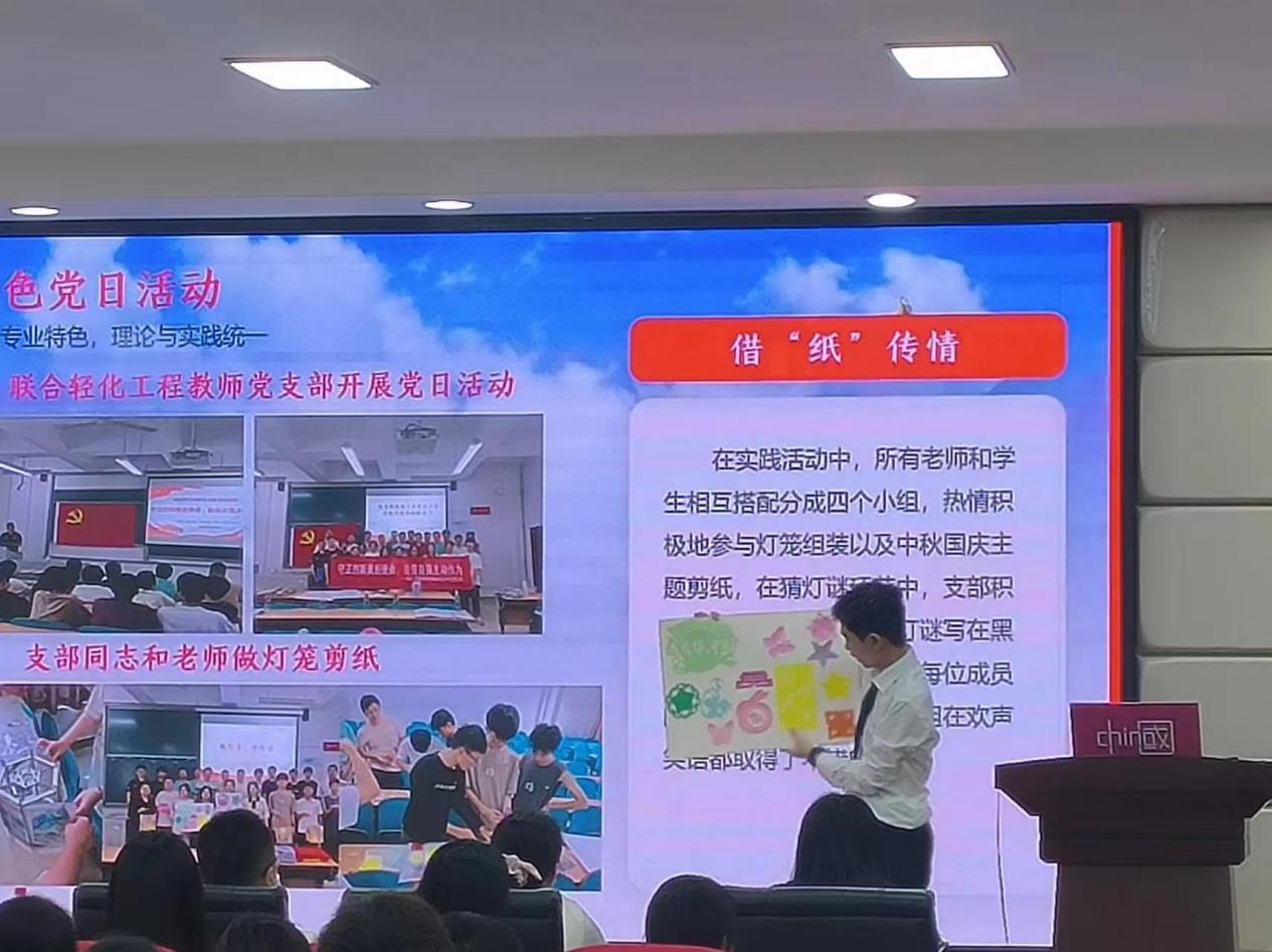 轻化本科生党支部着重介绍支部开展的特色党日活动,通过灯笼剪纸、借“纸”传情、志愿服务与春风送暖等结合轻化专业特色的系列活动,体现了支部在新时代背景下创新发展、艰苦奋斗的优秀品质;湿地使者党支部开展多次生态文明建设主题实践活动,进一步贯彻自身“湿地使者”绿色理念,并重视支部成员理论学习的日常化、实践化,充分展示了其支部精思细悟、知行合一的优良作风;化工本科生党支部以党政领学为主导,重视读原著、学原文、悟真理,并结合志愿宣讲、绿色徒步、学科竞赛等活动,将党的二十大学习成果深化、内化、转化,提升了其支部的凝聚力、吸收力、行动力;研究生第二党支部始终秉持严谨治学的理念,在“学”上深耕细作,在“思”上实干创新,组织开展了多场党课领学和支部共学活动。通过结合宣讲、参观、比赛等多种实践形式,充分展示了支部在学思共研方面的显著成果和勇于争先的优良作风;研究生第一党支部以特色论坛为切入点,并播放所拍摄的廉洁微电影,展示出支部的科创精神与良好氛围;应化本科生党支部积极响应学院号召,重视“学思践赛”四位一体,开展以学铸魂、以思正风、以践促行、以赛促干的系列活动,充分展示支部的竞争力、凝聚力。