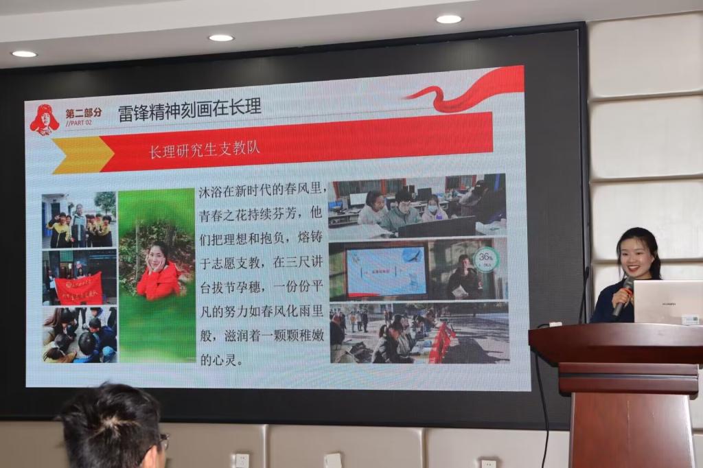三月雷锋月,本次宣讲以《学习雷锋精神,争做新时代好青年》为主题,宣讲人付圣莹分别从“学习雷锋精神”、“雷锋精神刻画在长理”、“雷锋精神流存世间”三个部分进行讲述,介绍了雷锋同志的生平,并列举了长理学子中从战士到硕士,以实际行动践行着爱国情怀的四名爱国军人、为山区的孩子提供更好的教育,以自身努力实现伟大的理想与抱负的研究生支教团队、以及疫情形势严峻时积极投身于志愿服务,化身“战疫天使”为大家的生命安全保驾护航的志愿者的实例,向我们证明了雷锋精神时刻围绕在我们身边,并熔铸于长理学子的行动中。最后,付圣莹以朗诵《雷锋日记》为引,号召在场同学一起“向雷锋同志学习”,传承雷锋精神,争做新时代好青年!