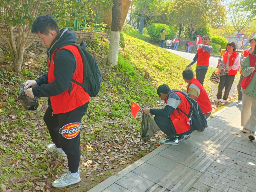 活动中,各党员志愿者手戴手套,细致地搜寻并清理道路旁草丛里的纸屑、饮料瓶、果皮、烟头等垃圾,进行垃圾分类、装袋处理。大家在活动中团结协作、热情高涨,充分展现了青年党员坚定自信、积极热情的精神风貌,身上的红色马甲闪耀着党性的光辉。