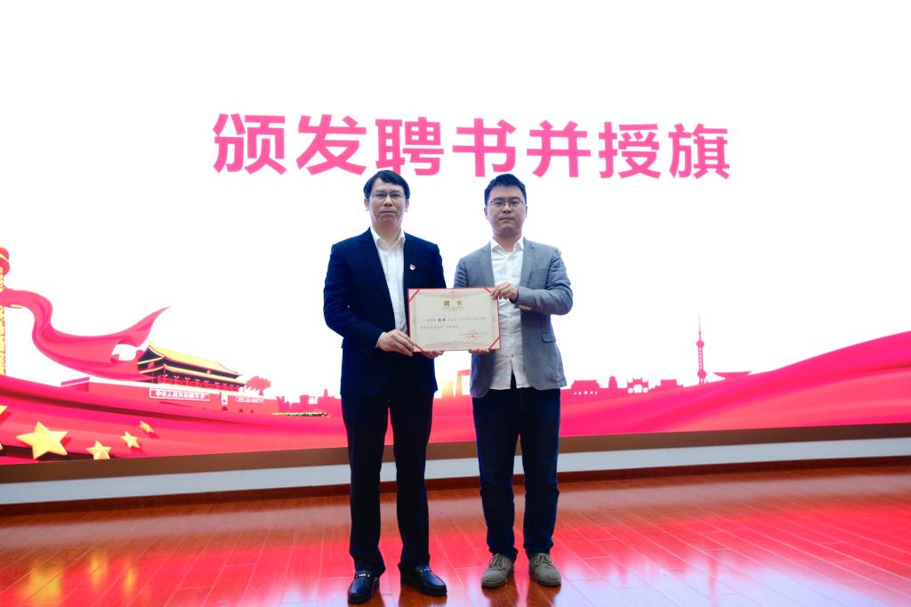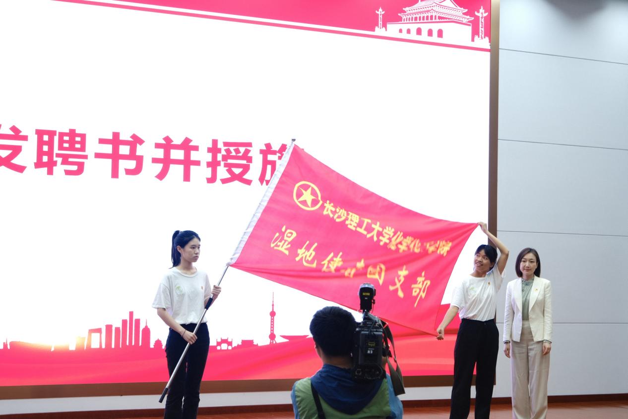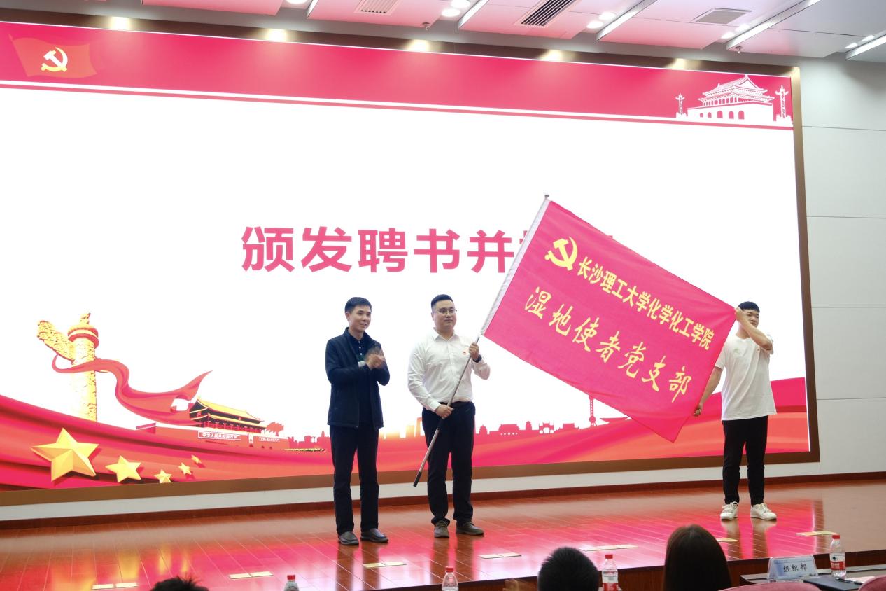 随后,王煜坤给党支部授旗,杨晨给团支部授旗,化学化工学院副院长(主持工作)张跃飞为“湿地使者”社团指导教师张进颁发聘书。