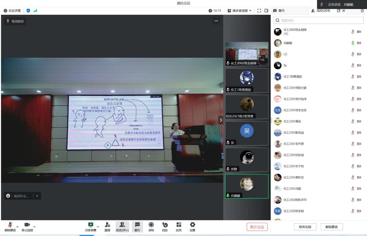 9月19日上午,化学化工学院举行了2023级本科新生入学教育之心理健康教育专题讲座,讲座采取线上腾讯会议的形式进行,由学院心理辅导员江洁老师主讲,新生辅导员陈楠以及2023级全体本科生参会。