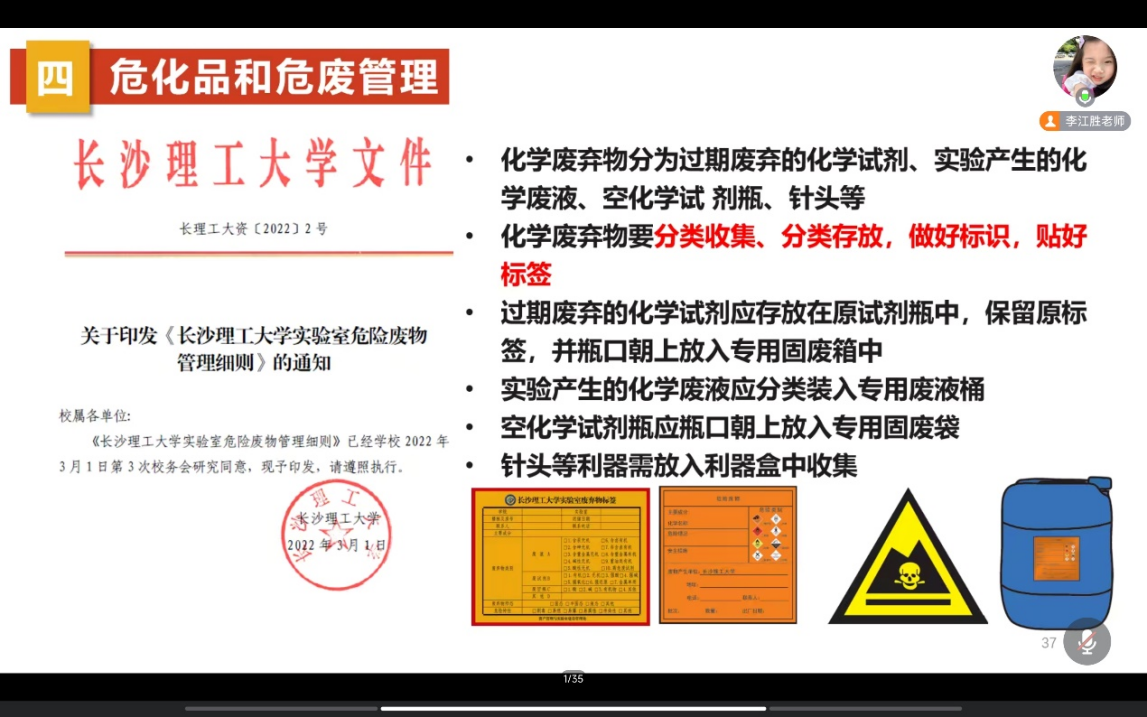 为了让新生掌握实验室安全知识,规范实验操作,加强对各类安全隐患及其应急处置措施的了解。9月21日下午,化学化工学院举行2023级本科新生入学教育之实验室安全讲座。讲座采用线上腾讯会议形式举行,讲座由学院实验中心主任李江胜老师主讲,本科新生辅导员陈楠和全体2023级本科新生线上参会。