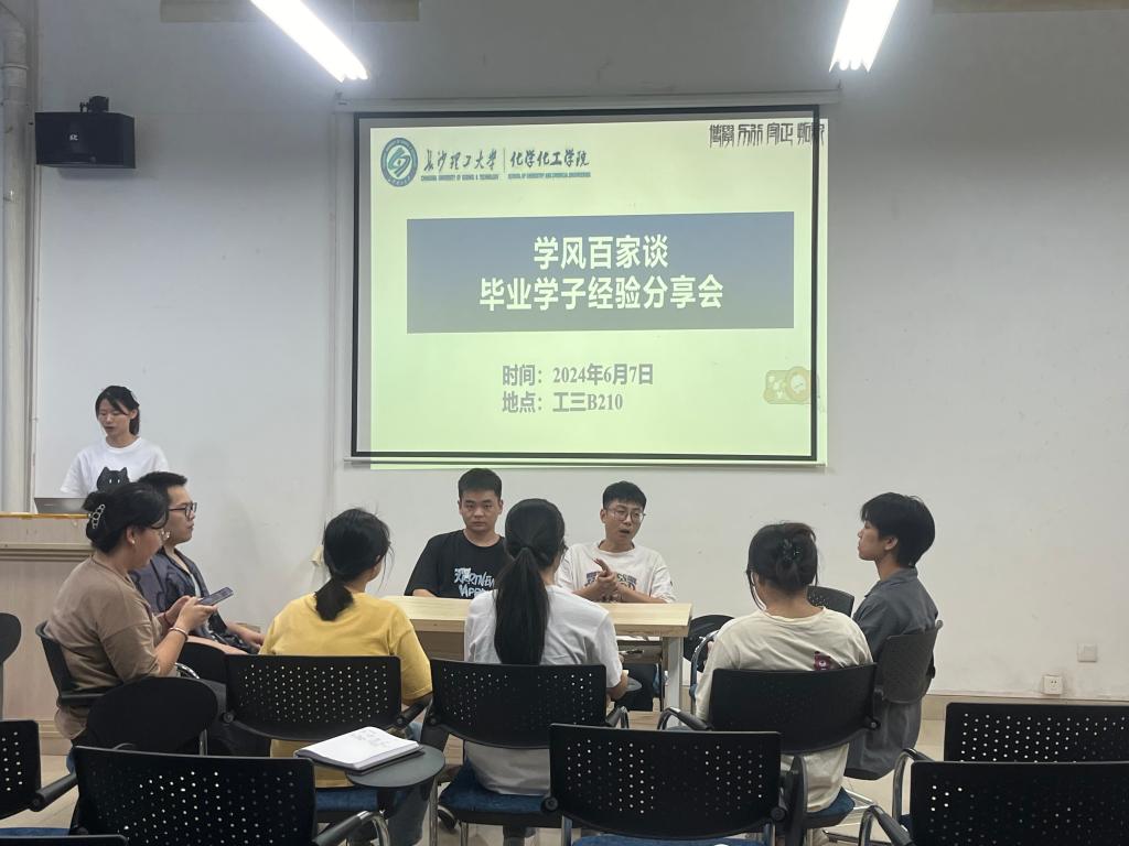 6月8日,化学化工学院于工三B210教室召开一场面向科研领域研究生的毕业生经验分享会。此次分享会旨在为在校研究生提供宝贵的职场经验和职业规划指导,助力他们在未来的职业道路上取得成功。会议由学院优秀学生代表黄婷主持,邀请了资深21级毕业生张益弘和周国强作为主讲嘉宾,吸引了研二及研一的部分学生积极参与。