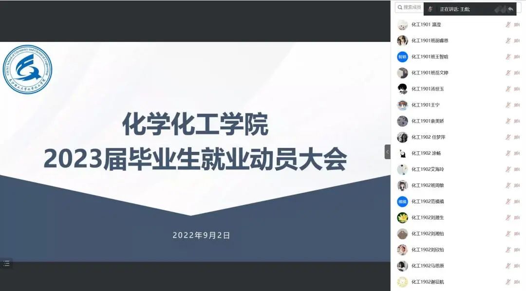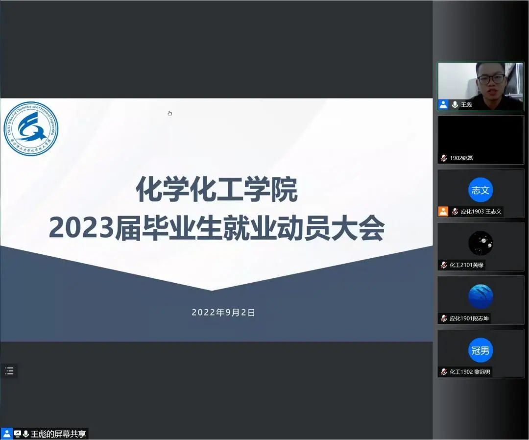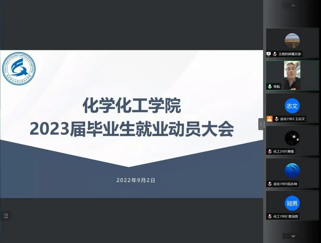 9月2日19:00,437必赢会员中心化学化工学院2023届毕业生就业动员大会以腾讯会议的形式召开。年级辅导员王彪主持会议,学院党委副书记陶双、就业专干张航出席,2023届毕业生参加。