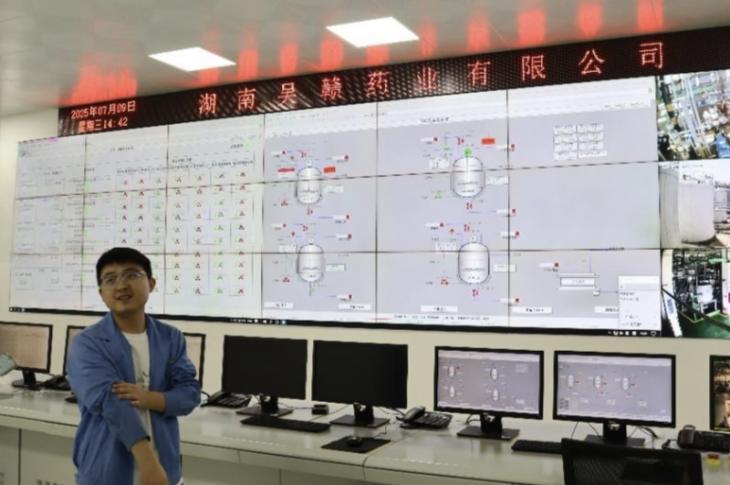 湖南吴赣药业有限公司工作人员在中控室向成员介绍DCS系统
