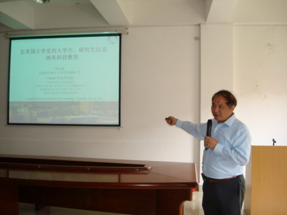 客座教授聘任仪式后,钟教授以“美国大学里的大学生、研究生以及纳米科技”为题给化学与生物工程学院的教师、研究生、本科生作了一堂生动精彩的报告。报告会在大家热烈的掌声中开始,钟教授与师生们进行了生动有趣的互动,他以问答形式向大家介绍了美国大学教育体制、大学生与研究生的培养机制及与中国的不同之处,并以在美国当教授的亲身经历向大家展示了美国教育的特色,最后钟教授从纳米科技出发,与老师们就教育教学与科学研究方式进行了深入的探讨和交流。