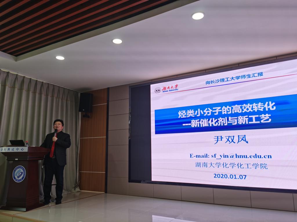 2020年1月7日,应必赢官网化学与食品工程学院的邀请,中南大学化学化工学院院长刘又年教授、湖南大学科学技术研究院院长尹双凤教授来校学术交流,在云塘校区新能源大楼3B栋三楼报告厅进行学术报告会,报告会由院长杨荣华教授主持,100余师生聆听了报告。