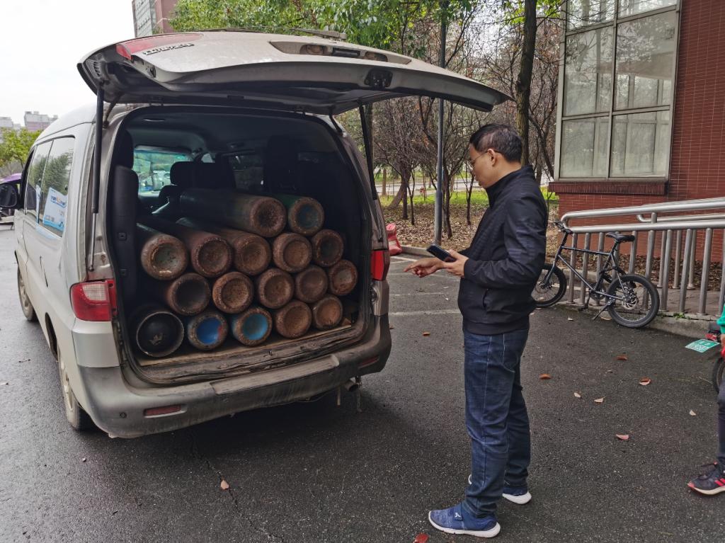 2020年11月17日上午,化学学院委托具有废旧气体钢瓶判废资质的长沙方罡气体有限公司对待报废钢瓶进行安全转移处置。化学学院副院长曹忠,实验中心主任李江胜,副主任陈永发和书记李志伟等老师参加。
