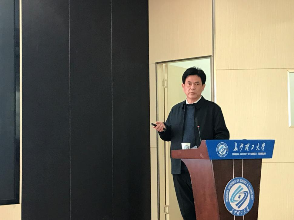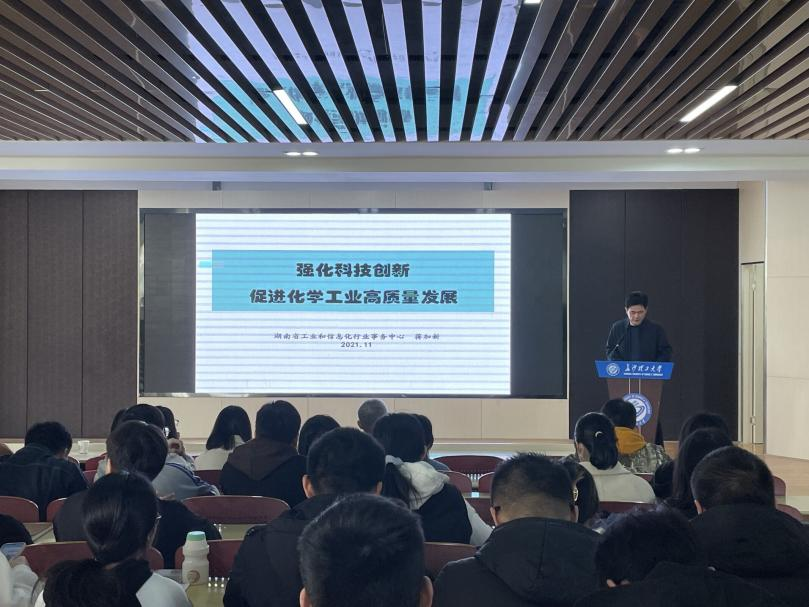 2021年11月25日10:00,应必赢官网化学化工学院邀请,湖南省工业和信息化行业事务中心副主任、正高级工程师蒋加新来必赢官网开展学术交流,在云塘校区工三A307做了主题为“强化科技创新,促进化学工业高质量发展”的名师学术讲座。讲座由电力与交通材料保护湖南省重点实验室主任曹忠教授主持,学院副院长张跃飞教授、陈启杰教授、喻林萍副教授,及学院教师和研究生百余人参加了学术讲座。