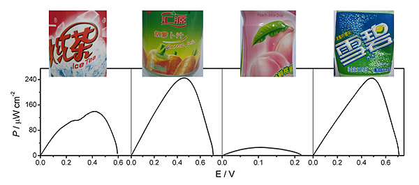 该课题组报道的酶生物燃料电池包括由碳纤维微电极制备的生物阳极和阴极,其中一种新型的碳纳米材料——单壁碳纳米角用来修饰电极以提高电子传递能力。生物阳极进一步修饰上葡萄糖去氢酶,在辅酶的作用下,催化氧化软饮料中的葡萄糖;生物阴极修饰上胆红素氧化酶,可将空气中的氧还原成水。由这两种反应组成的电路可用于构建微型能源装置,获得较高的能量输出。为能给小型电子设备供电,生物燃料电池需要微型化和更为广泛的燃料来源。在该体系中,从超市买来的软饮料可作为燃料直接使用,仅仅1 mL饮料(价格低于1分钱)能使燃料电池在间歇工作下产能近一个月。下图是该生物燃料电池从饮料中获得能量的功率输出示意图(从左到有依次为:茶饮料、蔬菜汁、果汁和碳酸饮料)。