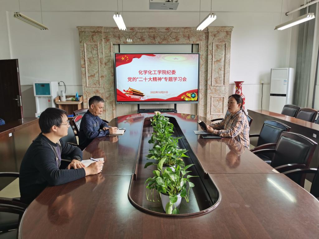 2022年10月31日,化学化工学院纪委于工三B318开展党的二十大精神专题学习会。本次会议由纪委书记陶双主持,纪委委员张雄飞、李焰参加。