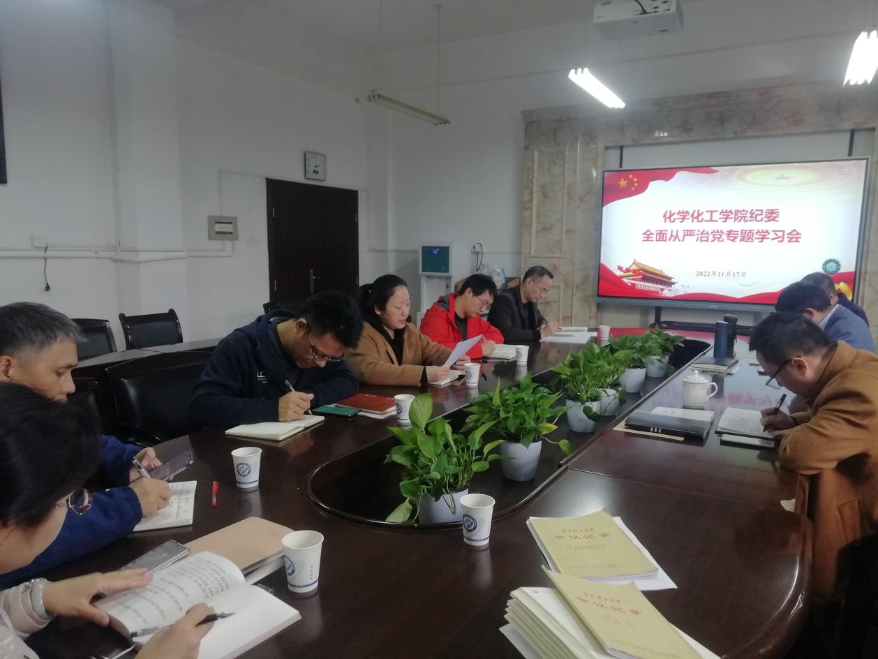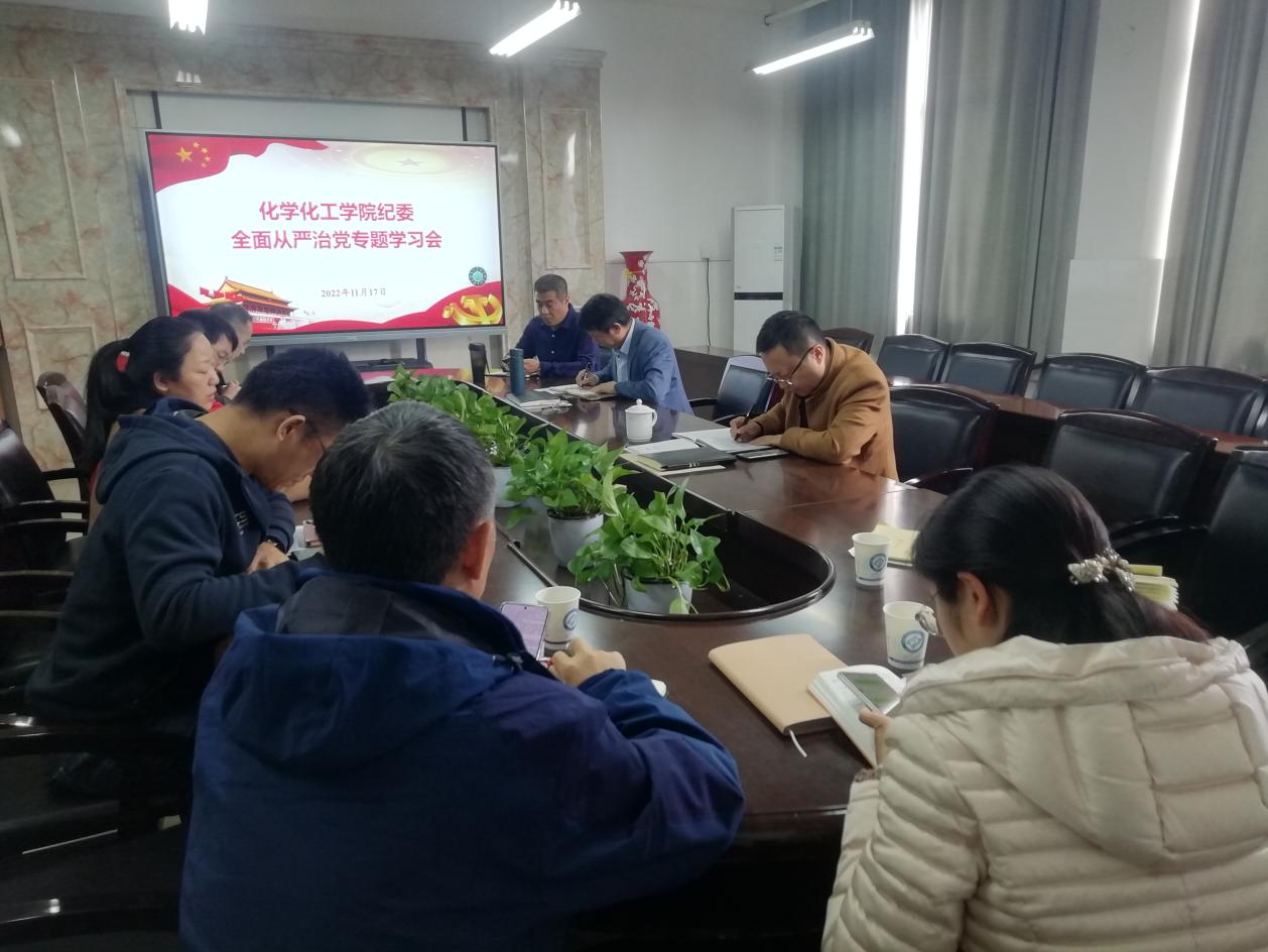 2022年11月17日,化学化工学院纪委参加学院中心组学习扩大会议,于工三B318开展全面从严治党专题学习会。本次会议由党委书记宋刘斌主持,学院中心组全员参加,纪委成员张雄飞、李焰列席。