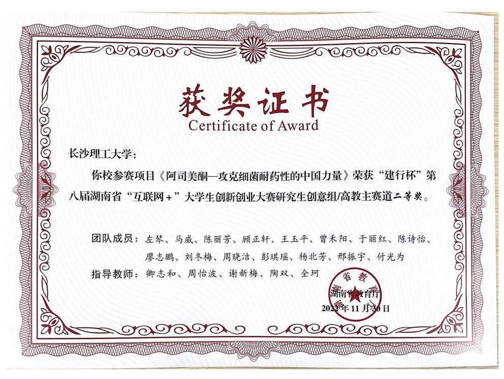 获奖等级:“建行杯”第八届湖南省“互联网+”大学生创新创业大赛研究生创意组/高教主赛道 二等奖