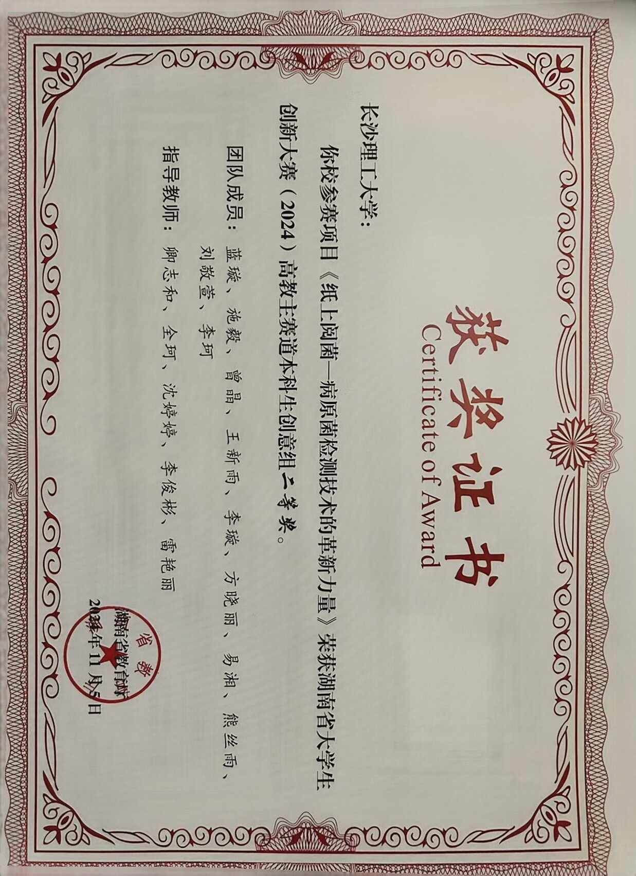 获奖等级:“建行杯”第九届湖南省“互联网+”大学生创新创业大赛高教主赛道研究生创意组 三等奖