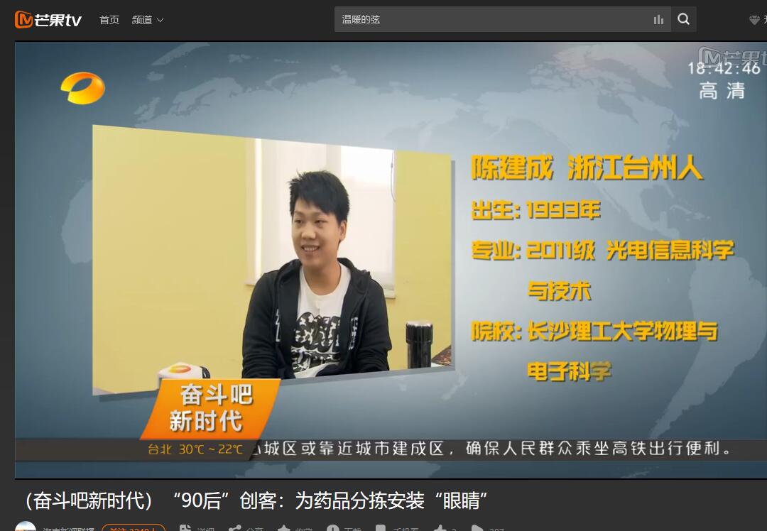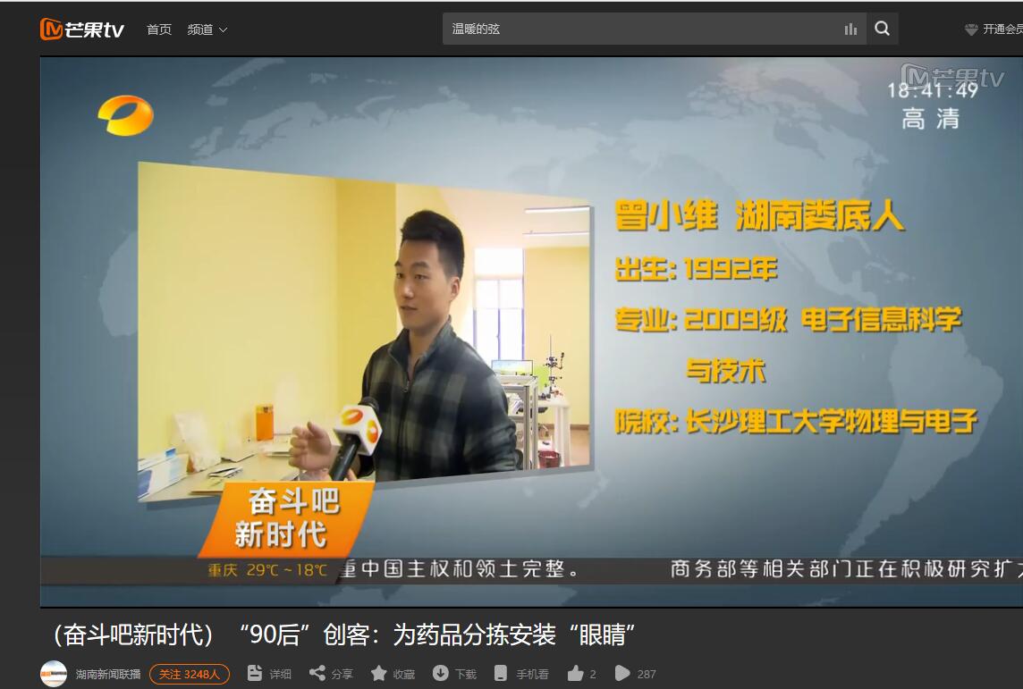 湖南卫视2018年5月8日新闻联播,报道了437必赢会员中心物理与电子科学学院3名毕业生的创新创业故事,曾小维、刘浪和陈建成分别是437必赢会员中心13、14、15届毕业生。大学期间,他们都是学院创新团队成员,曾获全国大学生电子设计大赛一等奖。2016年,开始借助机器视觉技术开发出计数和检验系统,能高精度、高速度完成散装产品(药片或胶囊)的外观合格检测和产品计数,技术填补了国内市场空白。
