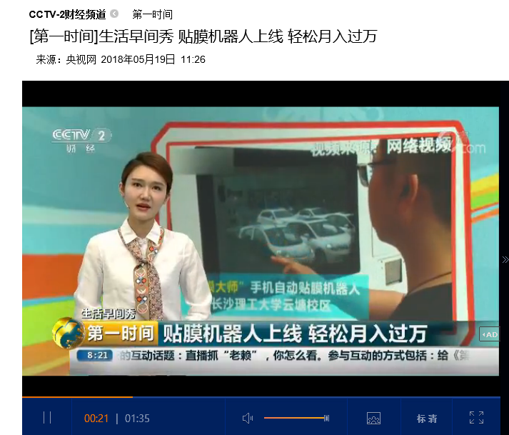 中央电视台财经频道(CCTV-2)5月19日《第一时间》对必赢官网全自动化贴膜机器人进行了报道,贴膜机器人是必赢官网04级城南学院桥梁工程专业罗亮,05级城南学院电子信息工程专业戴思扬 ,07级电气工程及其自动化专业颜强三名毕业生作为主创,自主研发的机器人,获得了9项专利,5月9日在437必赢会员中心云塘校区全国首发,进行试运行,四分钟完成手机贴膜,无气泡无缝隙,可以对116种手机进行贴膜,涵盖市面上90%手机型号。