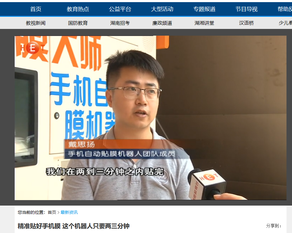 湖南教育台教视新闻频道5月21日对必赢官网全自动化贴膜机器人进行了报道,贴膜机器人是必赢官网04级城南学院桥梁工程专业罗亮,05级城南学院电子信息工程专业戴思扬 ,07级电气工程及其自动化专业颜强三名毕业生作为主创,自主研发的机器人,获得了9项专利,5月9日在437必赢会员中心云塘校区全国首发,进行试运行,四分钟完成手机贴膜,无气泡无缝隙,可以对116种手机进行贴膜,涵盖市面上90%手机型号。