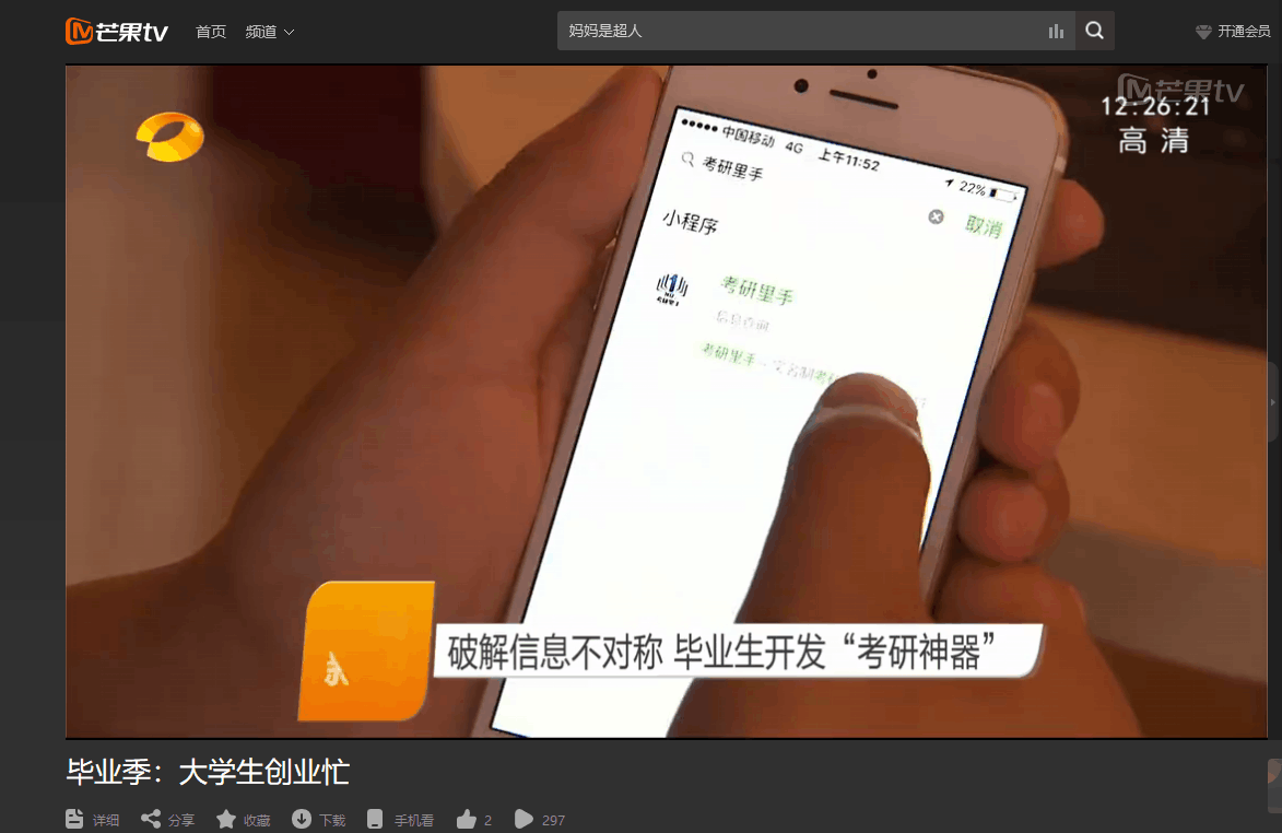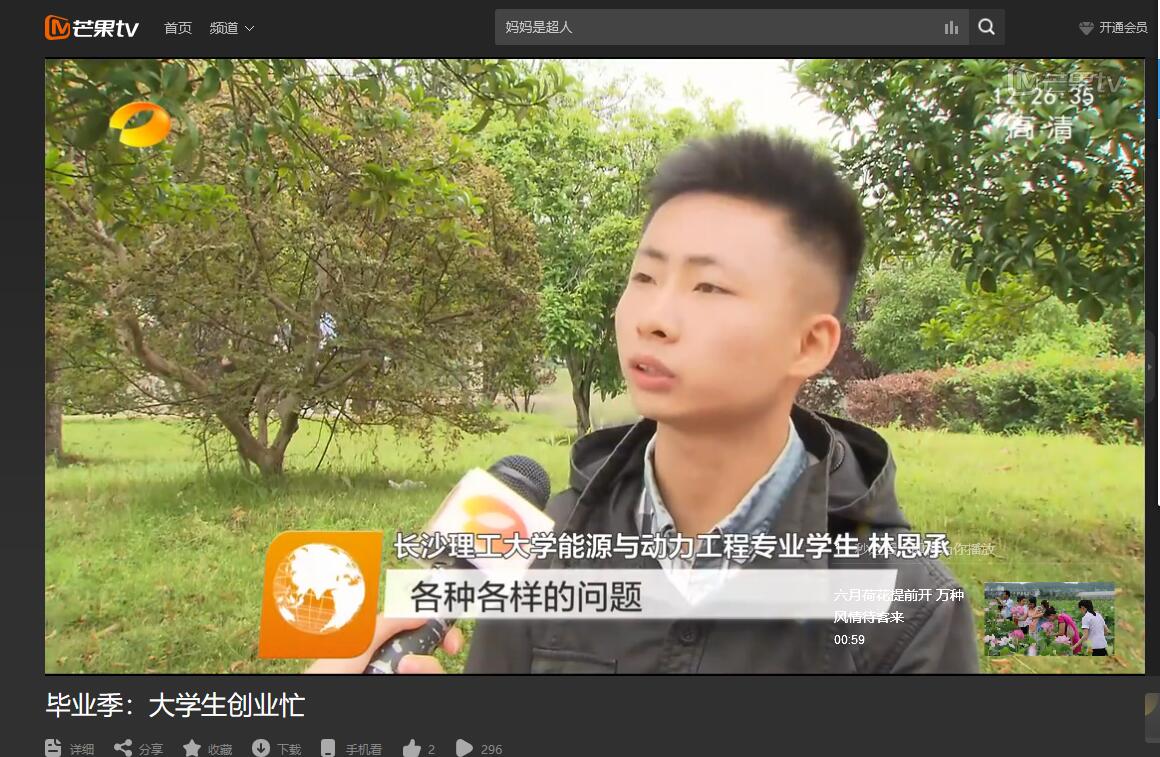 湖南卫视5月24日午间新闻对必赢官网能源与动力工程学院2014级学生林恩承与2015届毕业生李升志共同创业的故事进行了报道,为了给更多“考研族”引路,他们自主创业,开发了一款名为“考研里手”的微信小程序,旨在为考研学子与在读研究生搭起实时互动交流平台,将有效解决考研信息不对称的问题,极大提升备考效率。