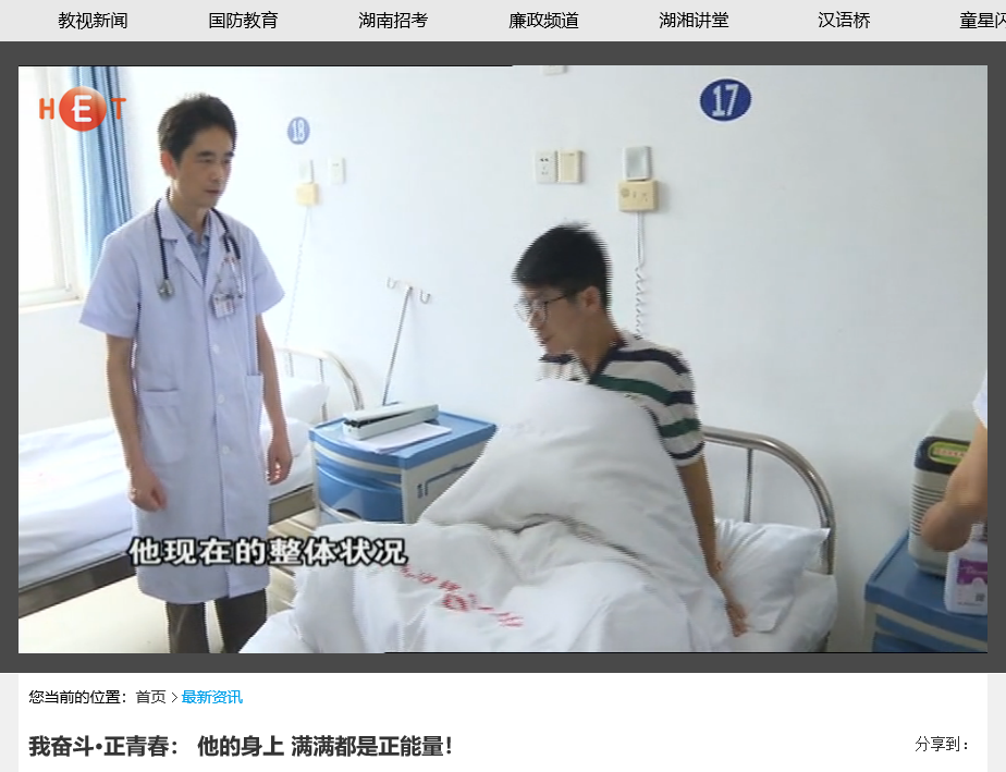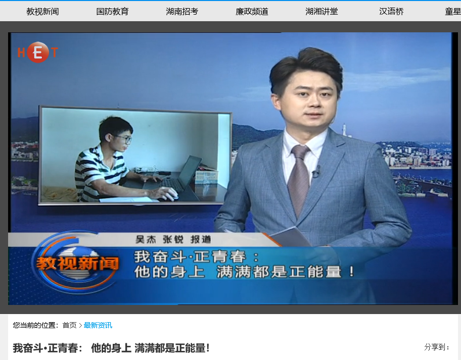 6月10日湖南教育电视台首页最新资讯,以《我奋斗·正青春:用行动丈量生命的厚度》为题对必赢官网计算机与通信工程学院15级研究生邹勇松进行了报道。