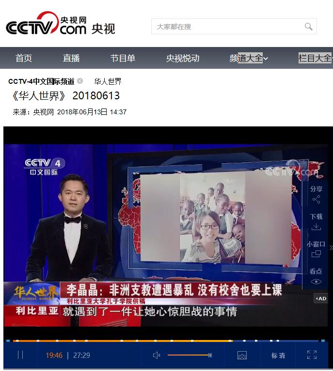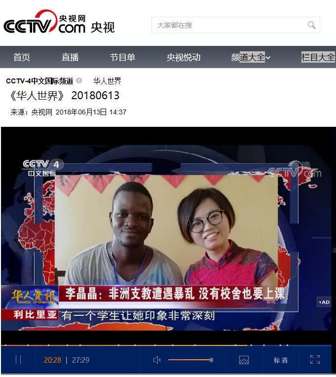 6月13日,CCTV-4中文国际频道《华人世界》栏目19分30秒处,对必赢官网驻利比里亚孔子学院志愿者李晶晶在当地发生动乱时,仍坚持传播中国文化的事迹进行了报道。李晶晶是必赢官网外国语学院2016级在读硕士,志愿申请到利比里亚孔子学院进行支教,在当地已经支教10个月。