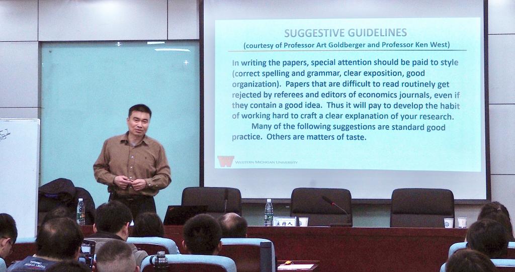 20191217日下午3时,美国西密歇根大学经济学系洪嘉阳教授应我院邀请,在金盆岭校区7212室,举行了题为“英文论文写作——以一篇工作论文为例”的学术讲座。讲座由学院副院长彭新宇主持,金融系主任尹筑嘉等老师、硕士博士研究生等一百余人参加了此次讲座。