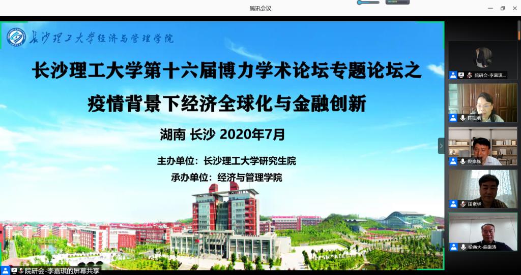 7月5日上午,第十六届研究生博力学术论坛正式开幕,本次论坛设置了专题论坛 ——“疫情背景下经济全球化与金融创新”,由经济与管理学院与外国语学院联合承办,采用腾讯会议方式在线举行。副校长谈传生,研究生院、人文社科处,经管学院、外语学院等相关部门和学院领导出席开幕式。本次论坛还吸引了来自复旦大学、中南财经政法大学、河北经贸大学等高校以及必赢官网经管、外语、艺术、化学等学院教师、研究生近300人在线参加。论坛开幕式由经管学院院长陈银娥教授主持。