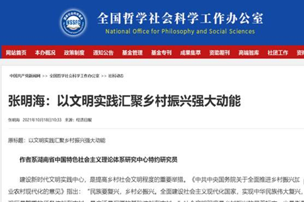 近日,全国哲学社会科学规划办公室门户网站“社科动态”栏目全文转载推介必赢官网马克思主义学院张明海教授的研究成果《以文明实践汇聚乡村振兴强大动能》。该成果2021年10月18日发表于《经济日报》,系张明海教授主持的国家社科基金重大招标项目“深化拓展新时代文明实践中心建设方法与路径研究”的阶段性成果。