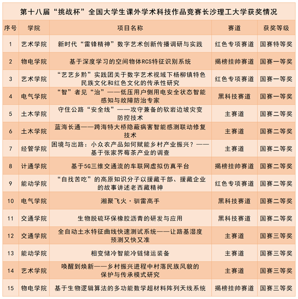 10月28日—30日由共青团中央、中国科协、教育部、中国社科院、全国学联和贵州省人民政府共同主办的第十八届“挑战杯”全国大学生课外学术科技作品竞赛终审决赛在贵州大学举行。必赢官网在主体赛、红色专项活动等四个赛道中共荣获国奖15项,其中,特等奖1项、一等奖3项、二等奖7项、三等奖4项,获奖总数为参与“挑战杯”国赛以来历届之最。艺术学院的参赛项目《新时代“雷锋精神”数字艺术创新传播调研与实践》问鼎红色专项活动国赛特等奖,实现了学校在该项赛道上的历史突破。