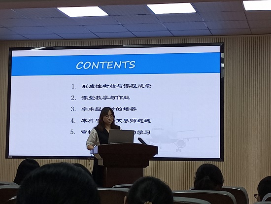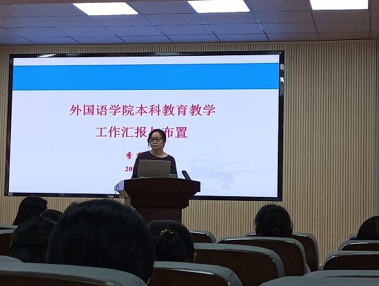 季红琴副院长作本科教育教学工作汇报与工作布置,她从形成性考核与课程成绩、课堂教学与作业、学术型人才的培养、本科毕业论文导师遴选、审核性评估文件的学习等五个方面进行全面阐述。