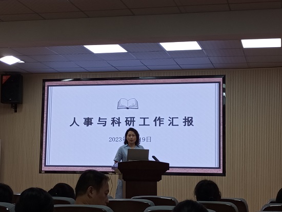 谭莲香副院长作人事与科研工作汇报,她介绍上半年已引进4位专任教师,并简述下半年学院引进计划。今年学院科研工作取得重大突破,1人晋升教师翻译专业职称;1获批国家社科基金1项,3人获批教育部人文社科基金项目3项,取得了历史最佳成绩