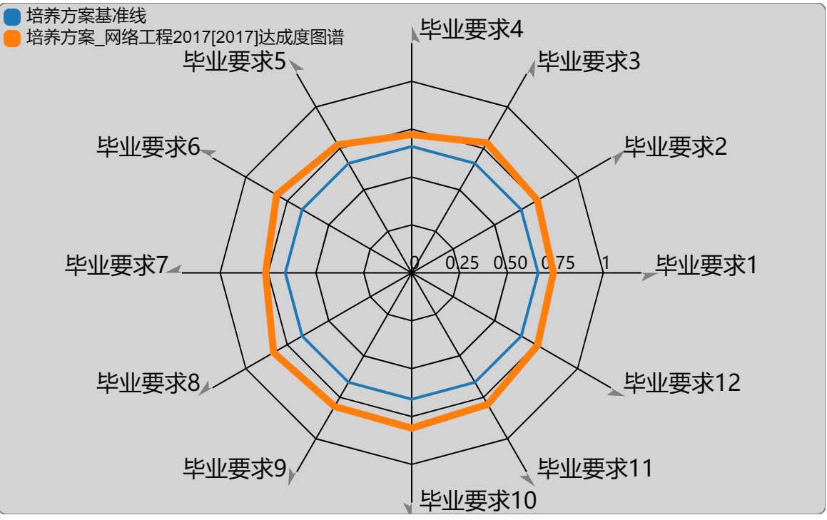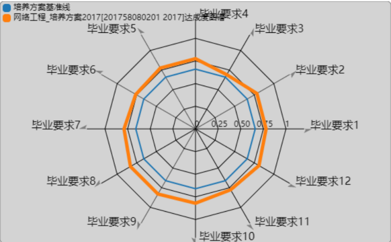 (2)系统协助专业完成直接的毕业要求达成评价,评价结果可以用EXCEL表的方式导出,以雷达图的方式来展示某届学生能力达成的分布图。