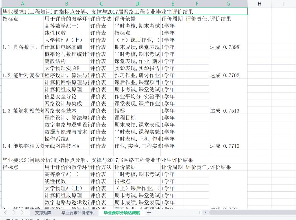 图6 网络工程2021届学生的毕业要求达成导出的部分EXCEL表截图