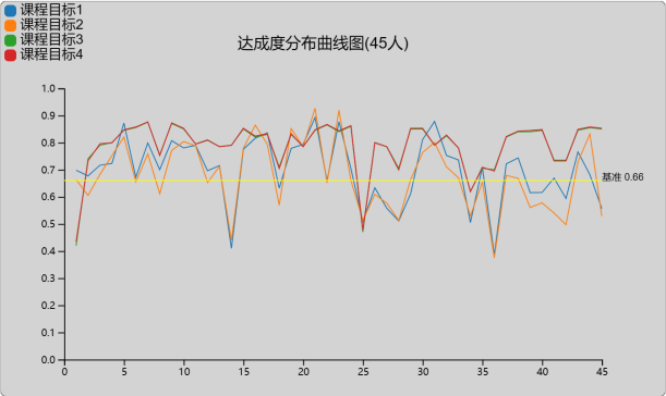 (1)系统协助教师完成课程目标达成评价,以散点图形式展示学生各个课程目标能力达成的分布图,以折线图形式展示该课程的全部课程目标的分布情况,并自动生成课程目标达成评价报告。