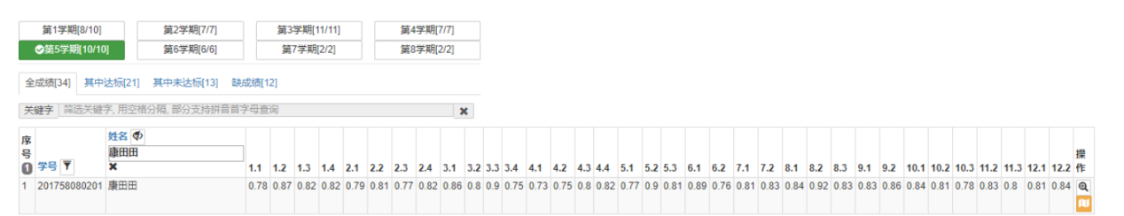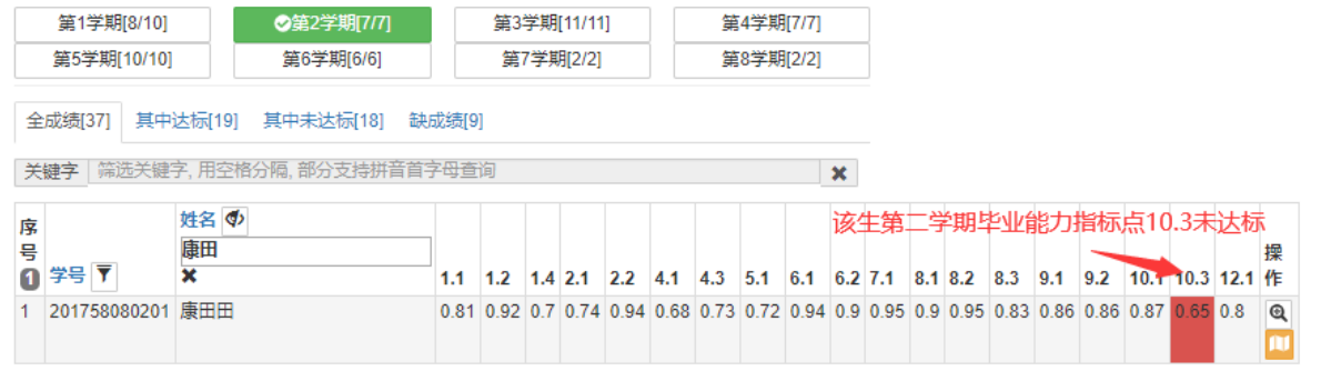 为了督促学生大学四年能达到毕业能力要求,为此针对本专业在校学生,借助学院开发的计易通系统对大学四年每个学期的能力达成情况进行跟踪和评估。下面以 2017 级学生康田田(学号:201758080201)同学为例来说明毕业能力形成性评价过程的评价和跟踪情况。根据课程目标与毕业要求的支撑关系,教师在每学期课程教学完成后,会收集整理本课程目标达成的评价数据,数据通过审核后,由授课老师把数据输入“计易通-工程认证”系统中,评价学生课程目标达成情况。这样系统就可以统计出学生该学期的所有课程目标能力达成评价值,根据能力达成标准,如果计算出该学生的某毕业要求达成评价值有小于预设值的情况,则把该生设置为预警学生,同时把该毕业要求能力点设置成高亮度。图8给出了该生第 2 学期的达成评价数据。从图中可以看出该生毕业要求指标点10.3 小于预设值 0.66,表明该能力这学期没有达到毕业要求,需要在后续的学期中重点关注该同学这个毕业要求能力指标点的培养。