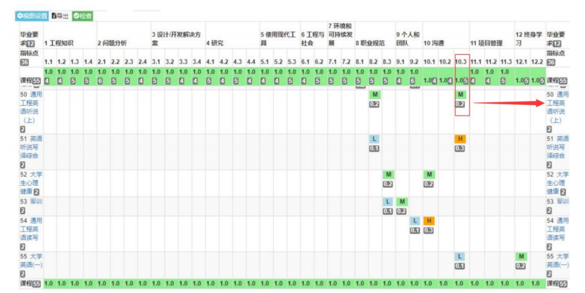 系统可以查询到在该毕业要求指标点上对应的后续课程(见图9),该生的班主任会把这个情况反馈给后续相应课程的老师,帮助该同学在后续课程上更多训练该项能力。针对康田田同学,通过查询系统,后续一个学期支持该毕业要求 10.3的课程为第3学期将开设的《通用工程英语听说(上)》。系统汇总后反馈给班主任,班主任会及时与该任课老师沟通,特别关注该同学在毕业能力10.3上的培养。经过一个学期的督促,在第3学期末,可看到该项毕业要求已经达成(见图10)。
