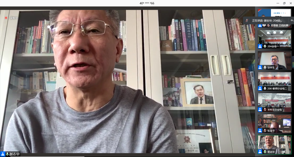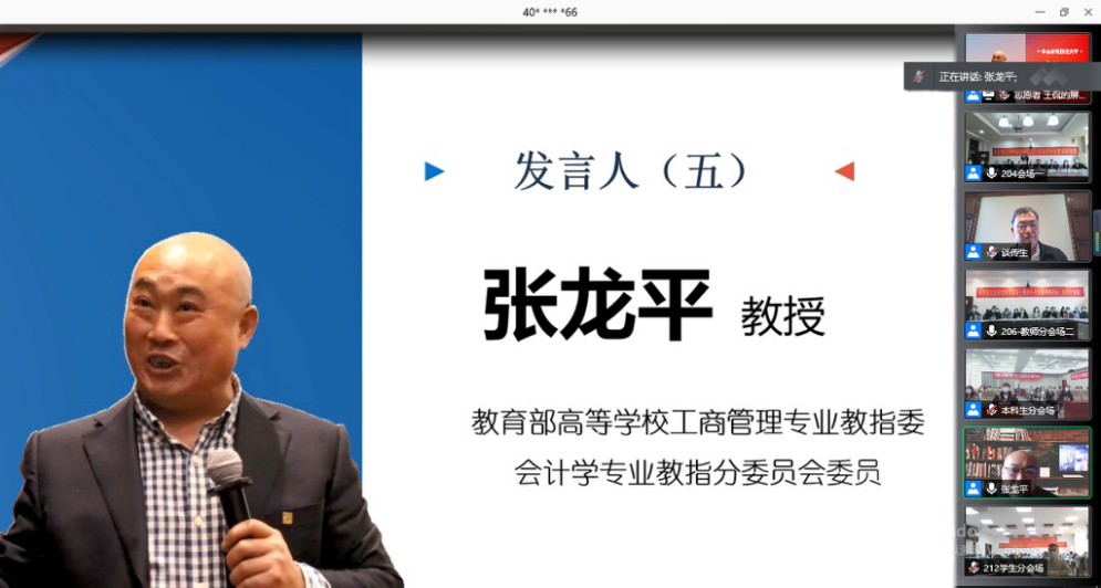 中南财经政法大学张龙平教授主持主旨报告。北京工商大学谢志华教授以《教育教学目的与会计一流专业建设》为题作主旨演讲,他从教育教学的本质着眼,深入分析了会计专业在新形势下应怎样实现一流突破、如何看待课程面临的挑战、实践环节如何为教育教学提供实效等思考。