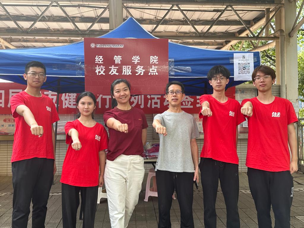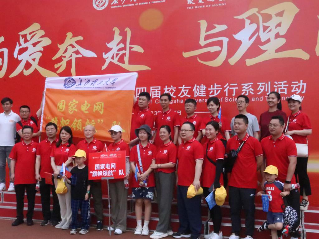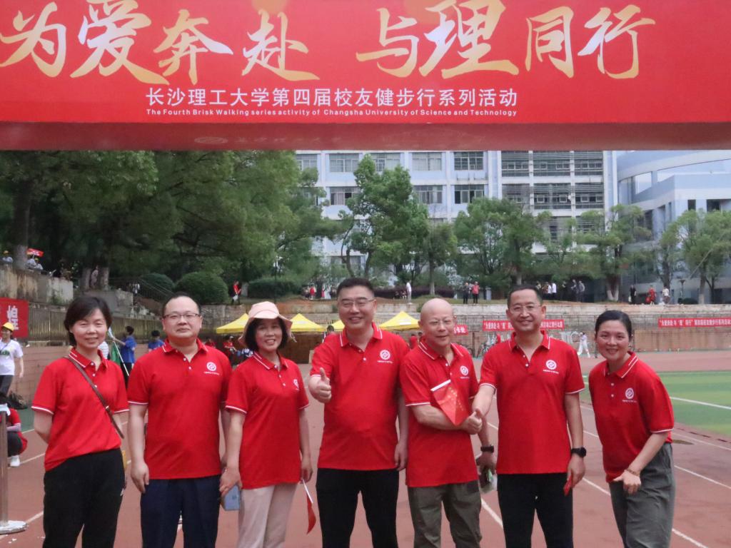 健步行开幕式上既有校领导、校友代表热情洋溢的致辞,也有活力四射的文艺表演,现场气氛热烈。此次返校的经管校友多为国网湖南电力公司员工,他们与公司的众多校友组成了“国家电网主‘旗帜领航’”队,身着统一的红色T恤,精神搂擞。开幕式结束后,健步活动正式开始,校友们分组出发,在金盆岭的田径场里争相健走,一路欢声笑语,既有师生相聚的亲切,也有新友相识的喜悦。尽管天气炎热,但大家互相鼓励坚持绕行跑道十圈,全都获得了校友会颁发的健步行勋章。
