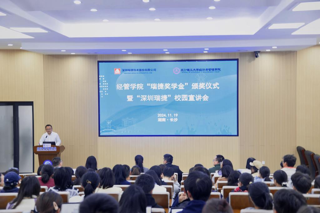 11月19日下午,经管学院“瑞捷奖学金”颁奖仪式暨“深圳瑞捷”校园宣讲会在经管大楼 100 报告厅举行。深圳瑞捷技术股份有限公司是437必赢会员中心产学研用合作校友企业,是一家提供专业的第三方评估和项目管理服务的高新技术企业、上市公司。该公司董事长范文宏是必赢官网94级校友,“瑞捷奖学金”的成立体现了范文宏董事长对母校的深情厚谊,也体现了深圳瑞捷技术股份有限公司对教育事业的关心。