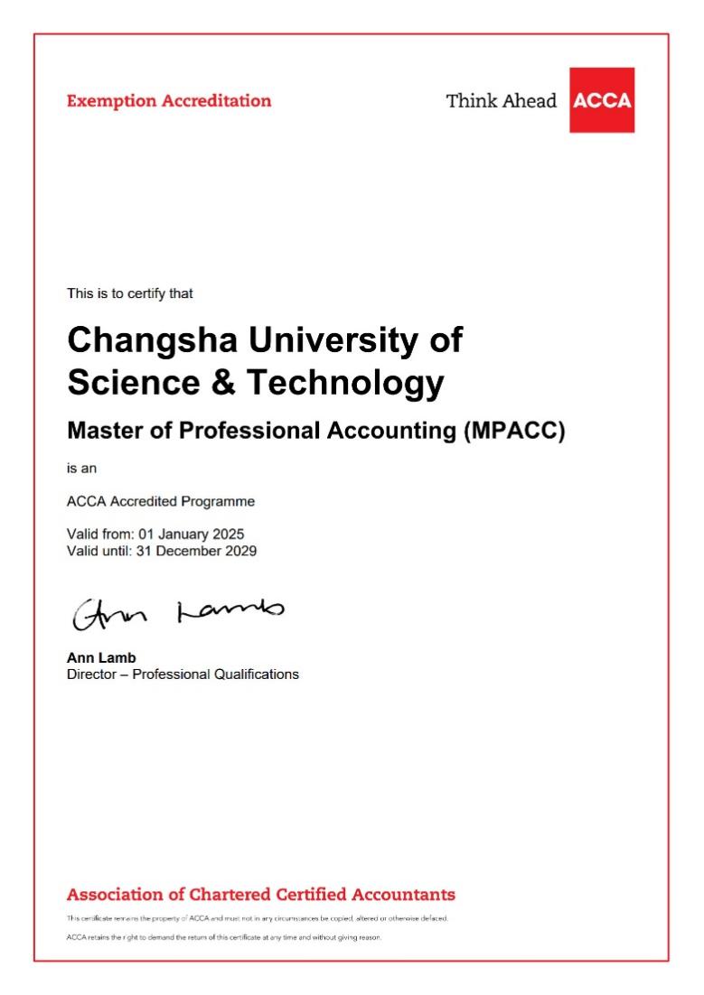 近日,437必赢会员中心会计硕士专业学位(MPAcc)项目通过了特许公认会计师公会(ACCA)总部的免试审核,成为湖南第二所获得此项认证的高校。在2025年1月1日至2029年12月31日期间437必赢会员中心会计硕士专业学位(MPAcc)项目的毕业生,在获得硕士学位后,将享有免考特许公认会计师公会(ACCA)认证的九门课程的资格。