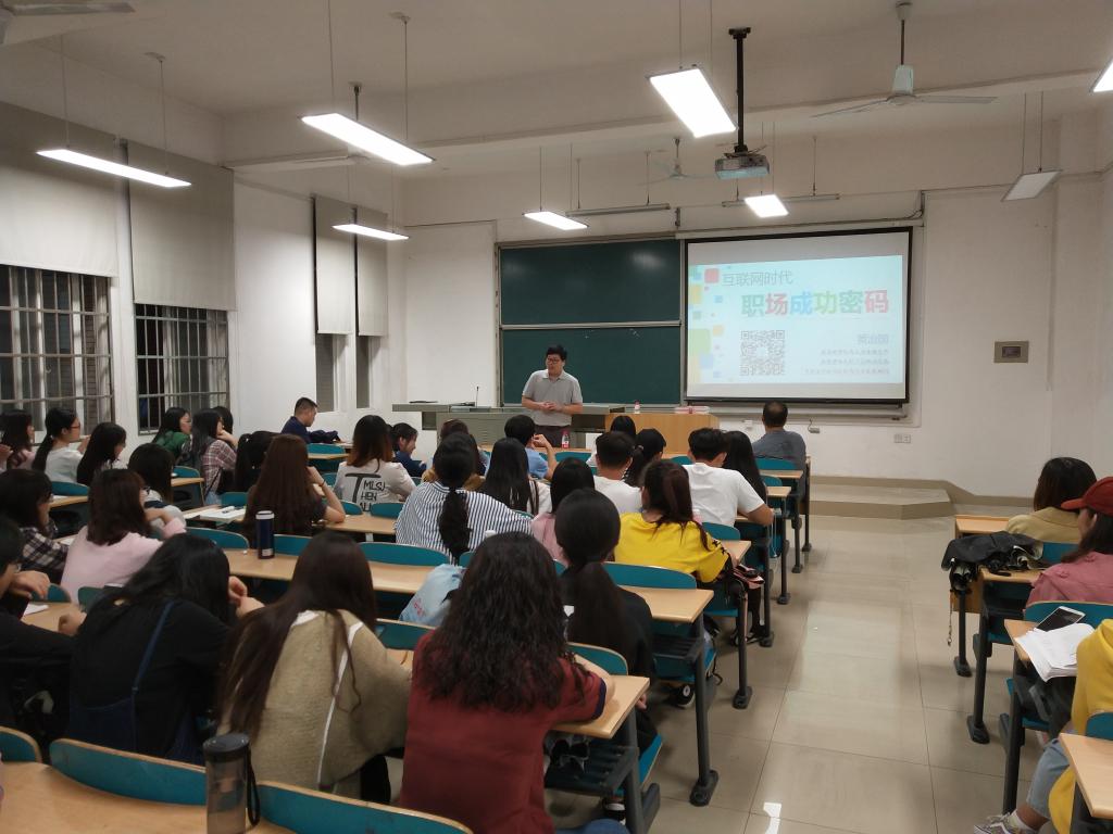5月31日晚上,在云塘校区文科楼A-207,玉台塾学习机构创始人黄治国先生应邀为必赢官网企业管理系本科生做了一场题为《互联网时代职场成功密码》的公益讲座,向市场营销专业和人力资源专业的学生介绍如何做好职业生涯规划。企管系系主任刘洪深和企管系100余名本科生参加了此次讲座。