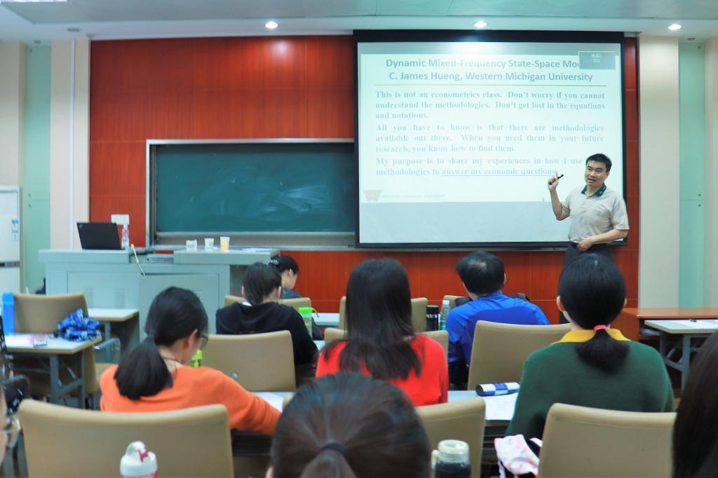 继16日上午“英文论文写作及发表”的主题讲座后,应学院的诚挚邀请,5月17日上午9:30,美国西密歇根大学经济学系洪嘉阳教授在金盆岭校区7教217再一次为大家作了题为“动态混合频率状态空间模型”的讲座。经管学院部分老师及研究生参加了本次讲座。